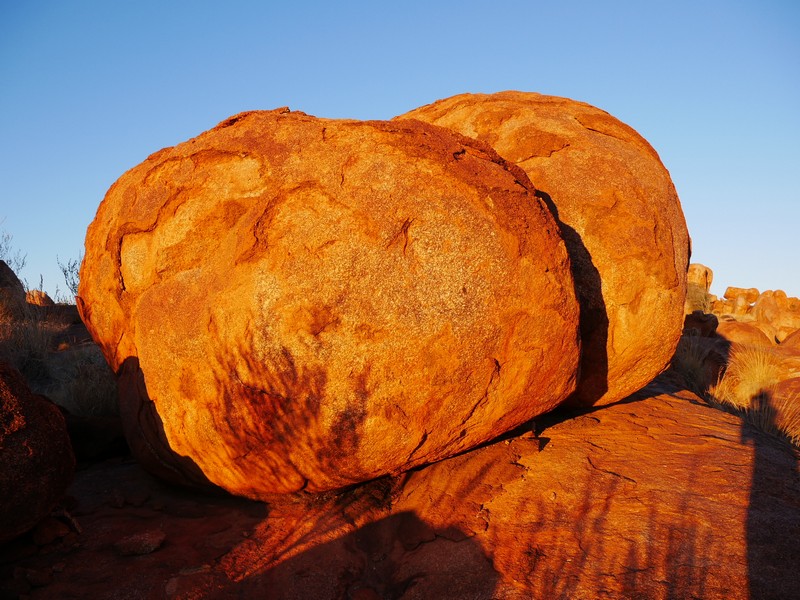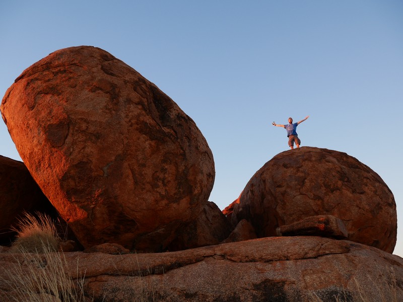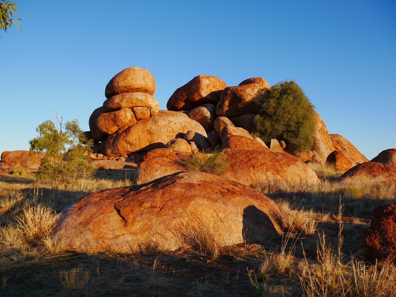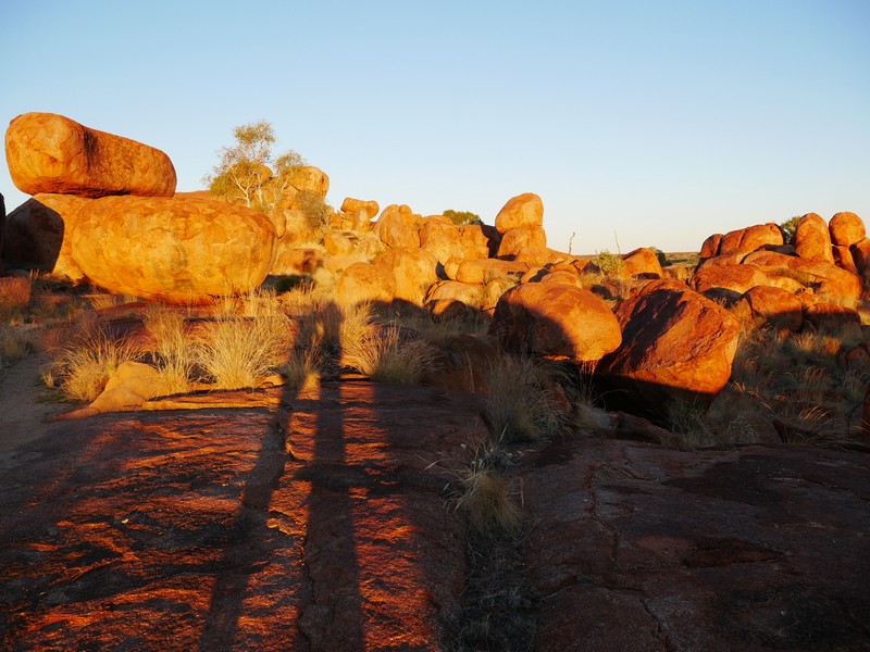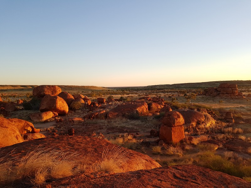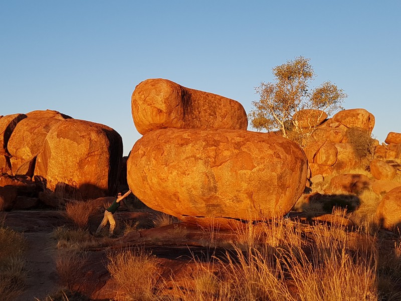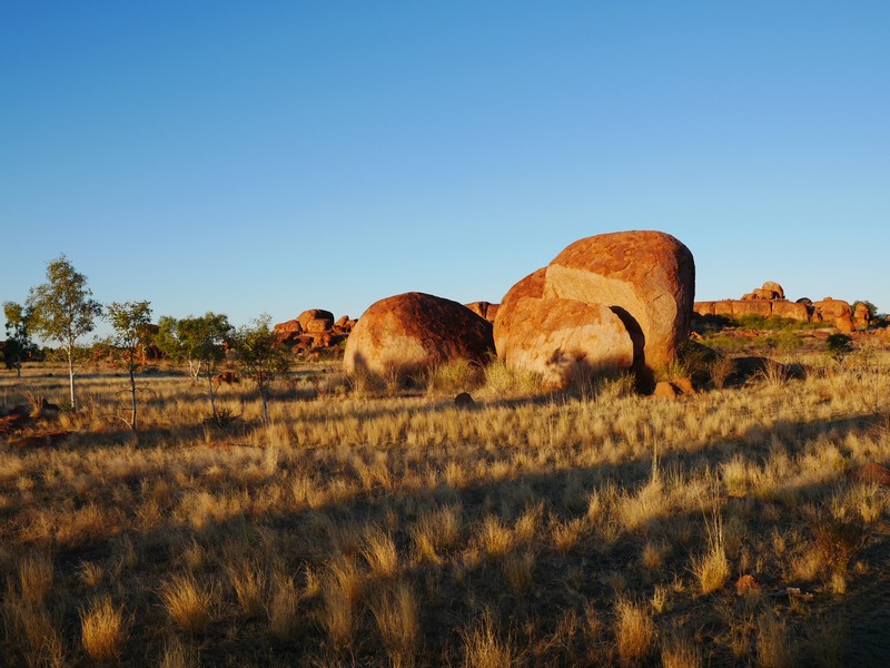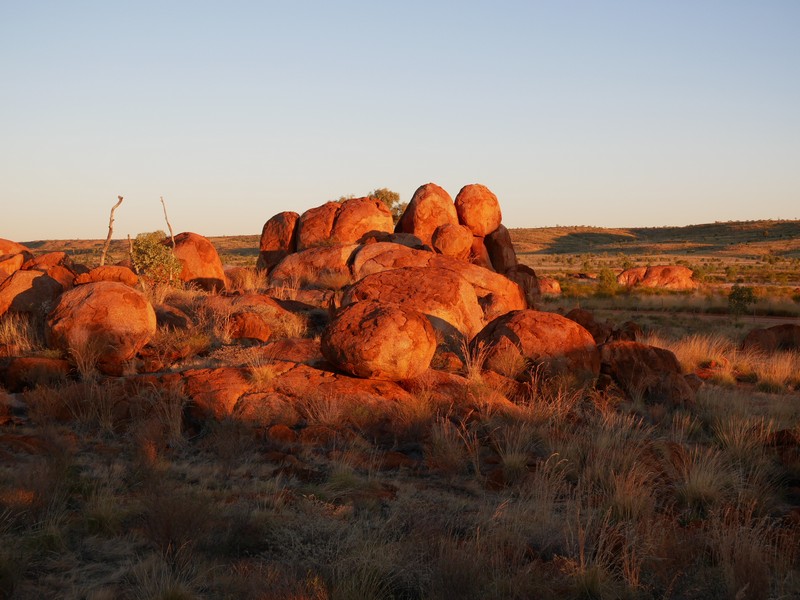 En chemin, nous sommes passés au Devil’s Marbles, amas de rochers plus ou moins sphériques, qui paraissent posés là comme des billes ; surréaliste. Le soir, sur une des nombreuses aires de camping gratuites, nous avons échangé avec deux couples de retraités sur leur vision de l’évolution de la société australienne et des relations blancs-aborigènes. Très intéressant mais compliqué à synthétiser.